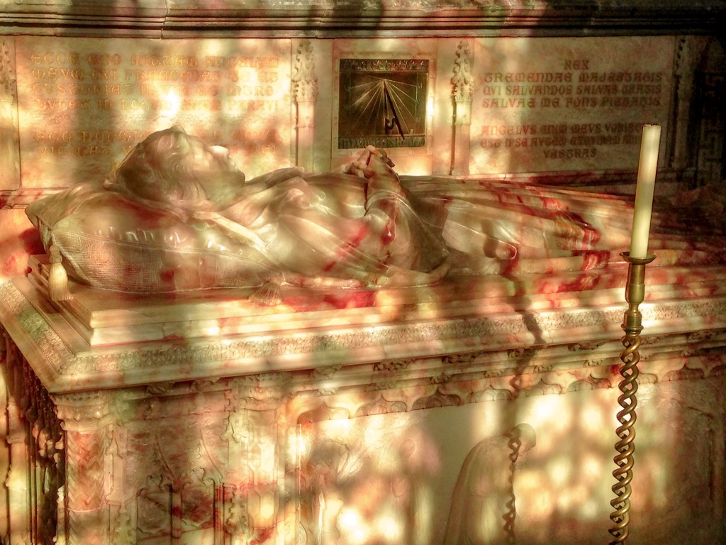 Prince Ashtar sleeping in his Sarcophagus beneath stained lead-glass windows during sunset at St. Davids’s Cathedral, Wales. Photo by myself.